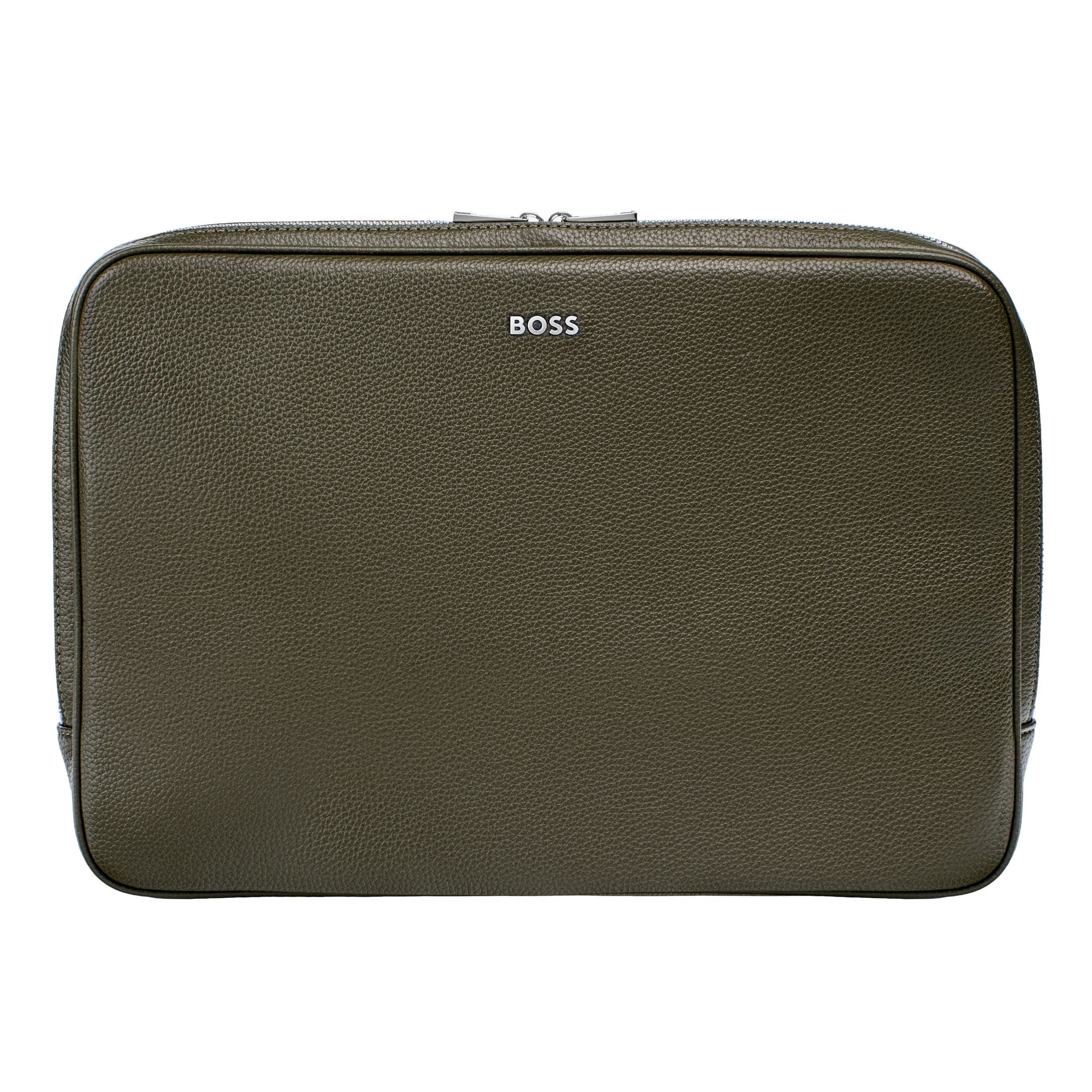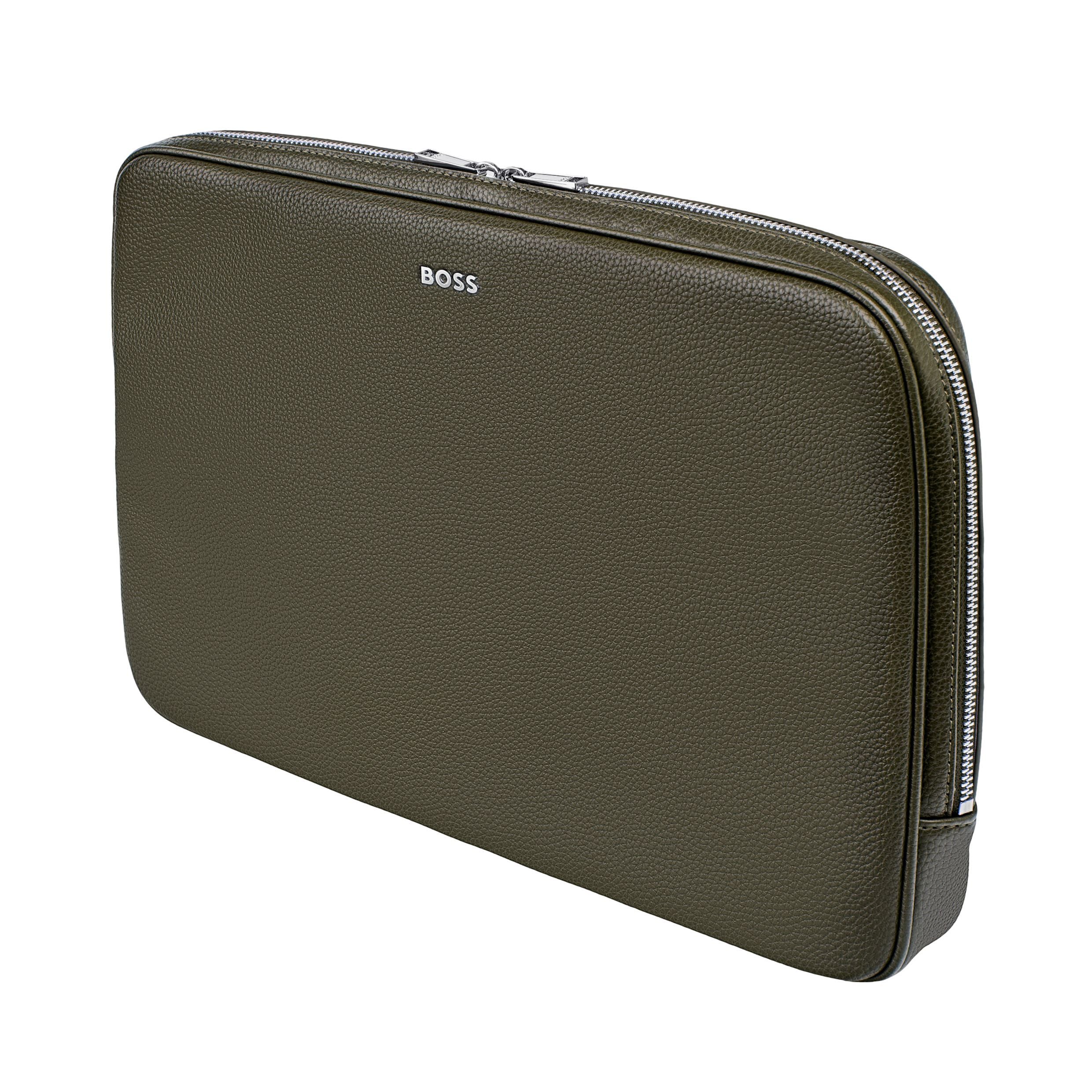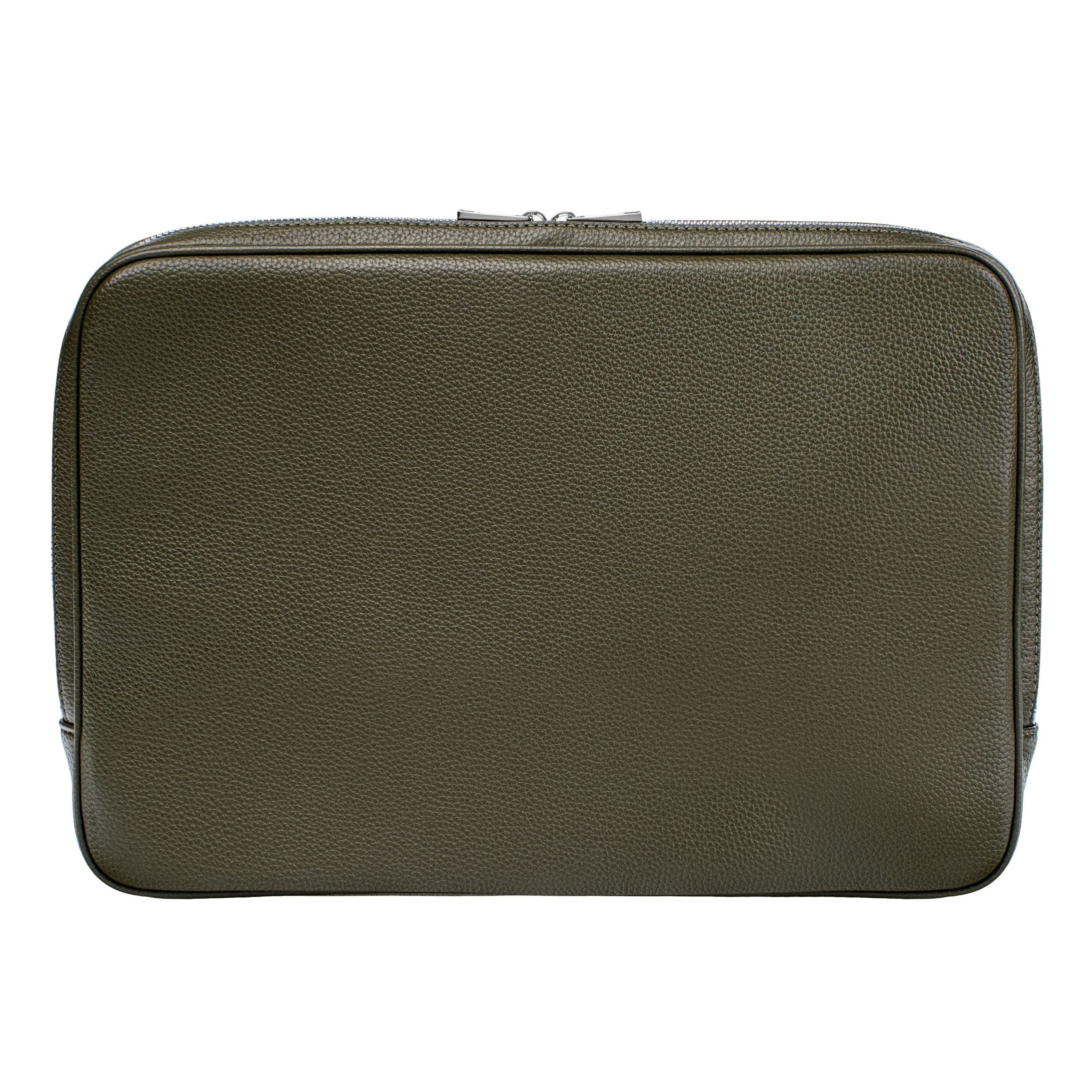 Grained Classic 電腦內膽包採用柔軟的粒面皮革紋理製成,飾有清爽的鍍鉻標誌性銘牌和配套的鍍鉻拉鍊。內襯採用同色系字母印花,展現精緻的質感。內膽包採用多個隔層設計,可妥善收納各種物品,從筆、文件到線纜、卡片或手機,應有盡有。顏色有黑色、海軍藍、卡其色和灰褐色可選。